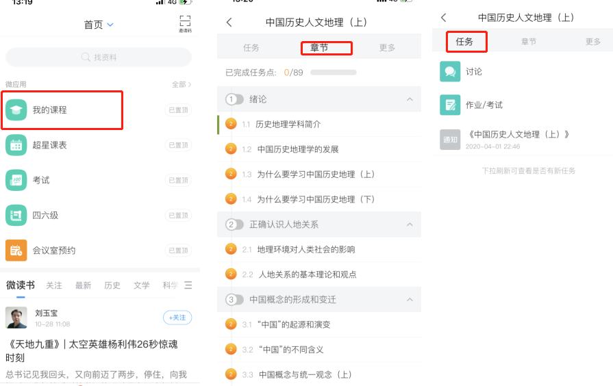 3、登陆后到个人学习界面,在学习界面“我的课程”寻找要学习的课程,并完成相关考核,如:章节测验、作业、考试和讨论等,如下图。