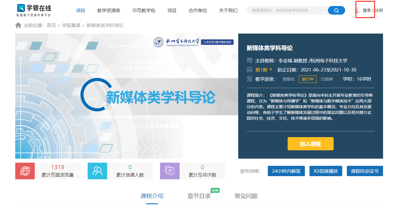 1、输入自己想要学习的学科专业导论课网址,跳到如下界面,点击登录。