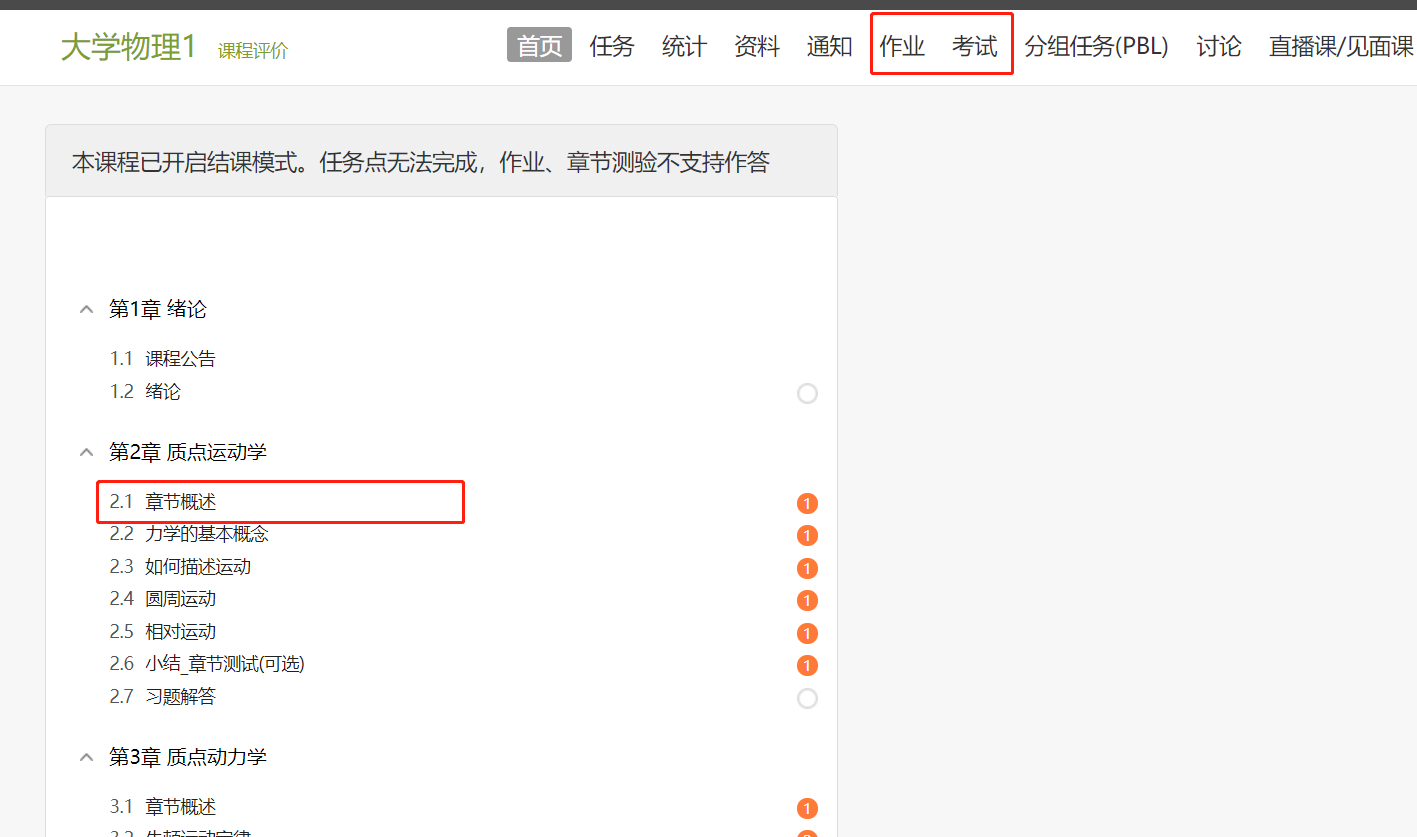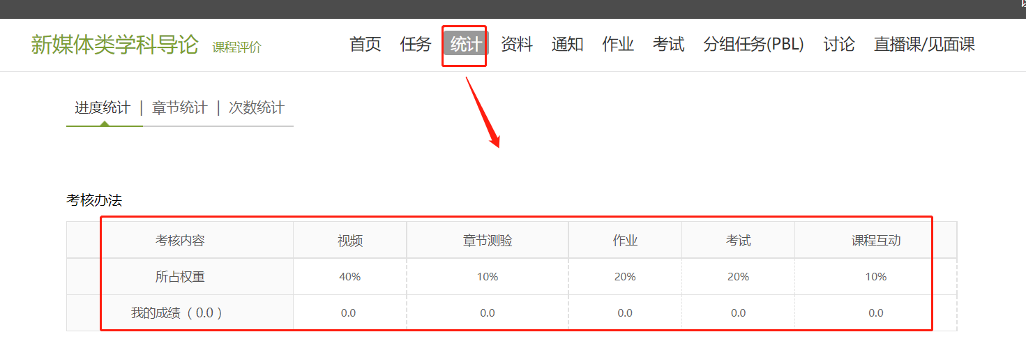 1. 点击需要学习课程图标进入学习界面,点击章节进行视频学习,并完成相关考核,如:章节测验、作业、考试和讨论等(具体考核在课程统计处查看),如下图。