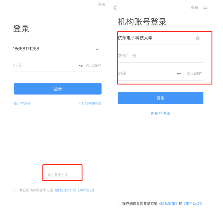 2、学习通登录,选择最下面其它方式登录—输入杭州电子科技大学—学号为录取通知书编号—密码为身份证后六位*如已在PC端修改,请用修改后密码)—点击登录。首次登录需要修改密码。