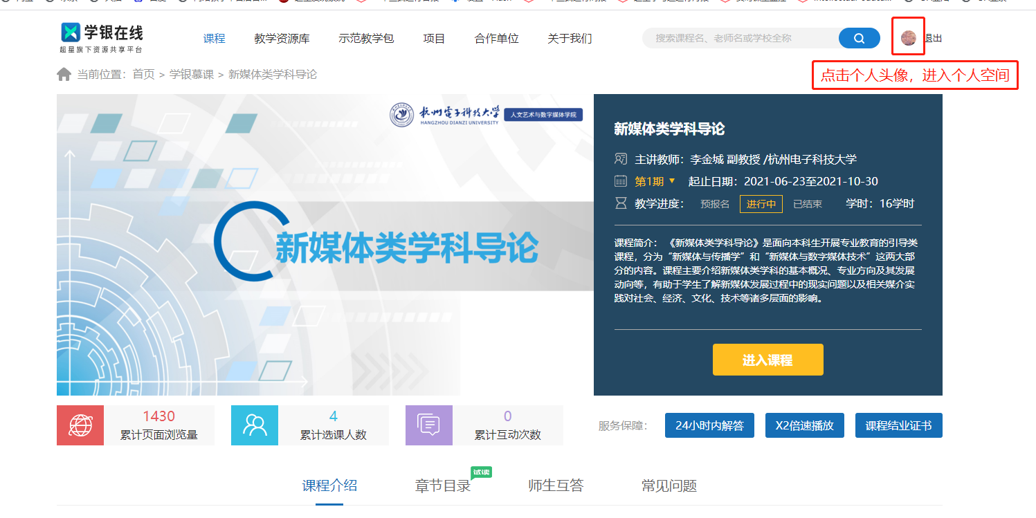 1. 登录成功后进入自己选读课程界面点击加入课程,加入成功后课程添加至自己个人空间,点击个人头像处即可进入个人空间。