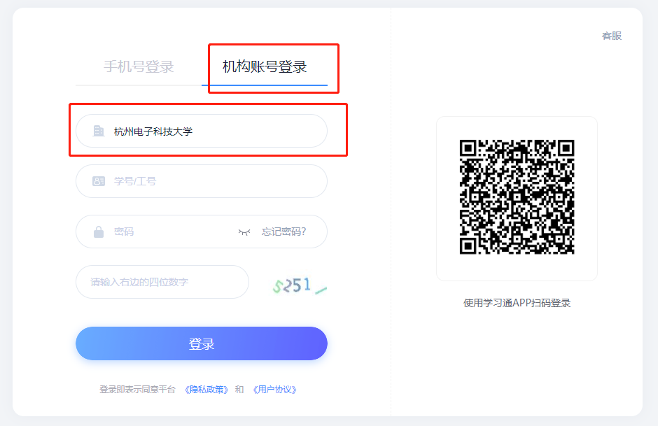 1. 点击登录后,跳出如下界面,选择机构账号登录—输入杭州电子科技大学—学号为录取通知书编号—密码为身份证后六位如已修改,用修改后密码)—输入验证码—点击登录。